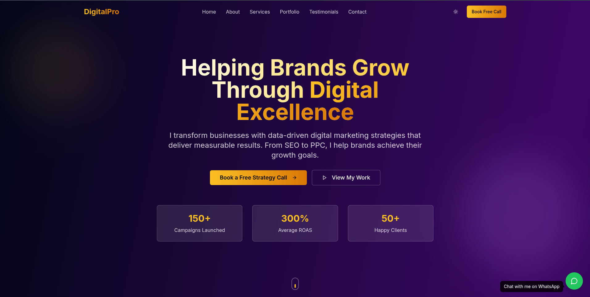 A sleek and professional portfolio website built for digital marketers to highlight their campaigns, case studies, testimonials, and services.